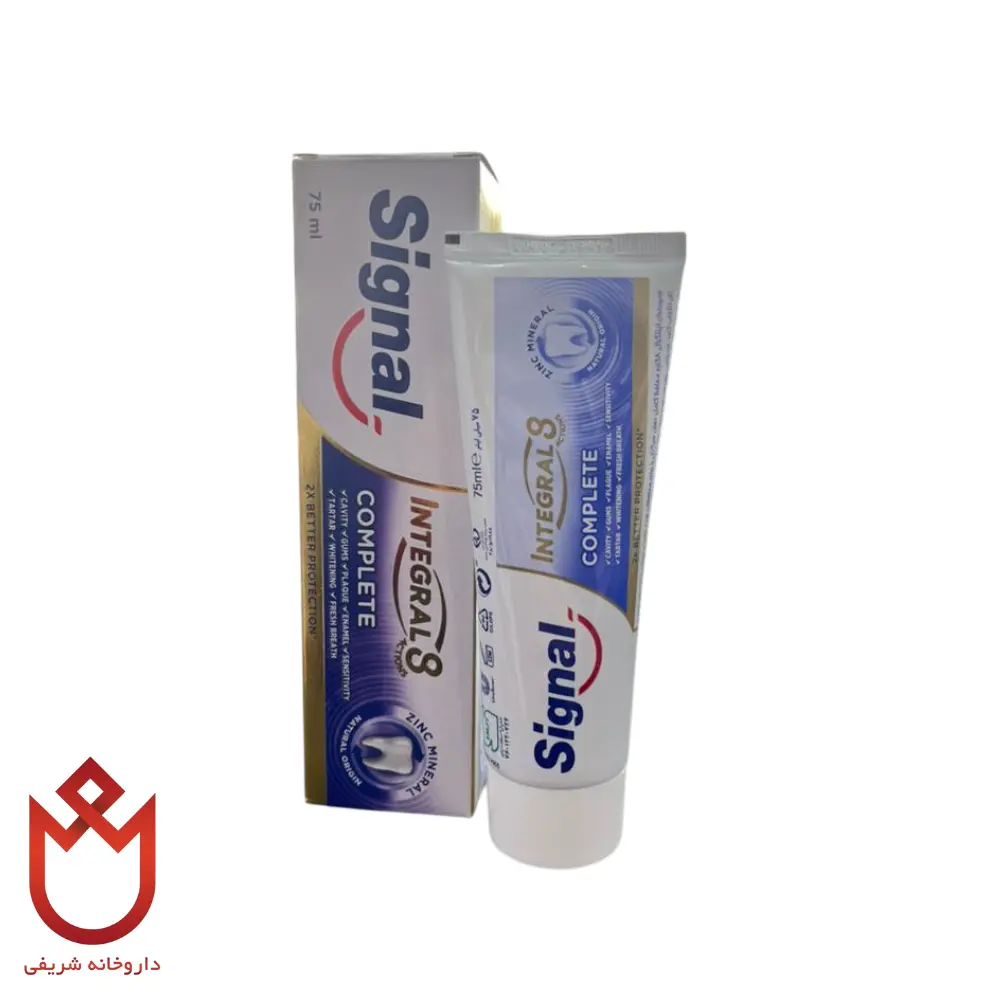 خمیردندان ۸کاره کامل سیگنال ۷۵ گرم یک محصول چند منظوره و حرفه‌ای برای مراقبت جامع از دهان و دندان است. این خمیردندان با ترکیبات ضد پوسیدگی، ضد حساسیت و ضد پلاک، تجربه‌ای ملایم، مؤثر و طولانی‌مدت از مسواک زدن ارائه می‌دهد. استفاده منظم از آن باعث تقویت مینای دندان، کاهش التهاب لثه، کنترل پلاک و بوی بد دهان می‌شود و سلامت دهان و دندان را به صورت کامل حفظ می‌کند. محصول اصلی این برند با کیفیت تضمینی در داروخانه دکتر شریفی موجود است و برای خرید آنلاین آماده است.
